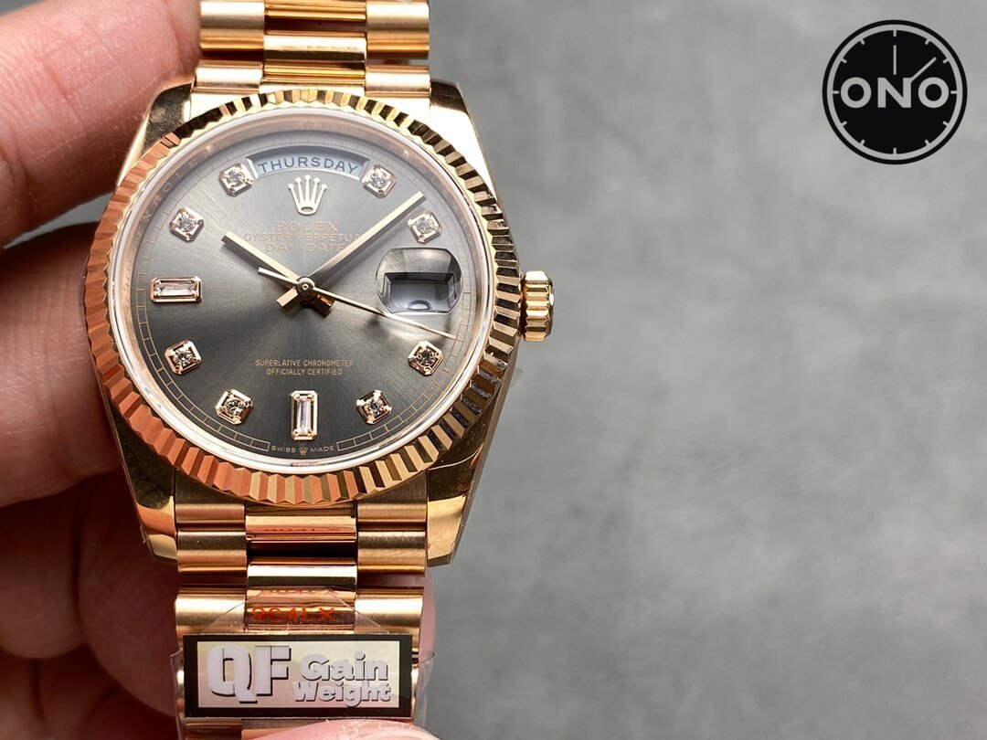 Home Rolex Day Date ONO QF Rolex Day-Date 128235 Asian 2836 36mm Slate Gray Dial 18k Rose Gold Case Gain Weight