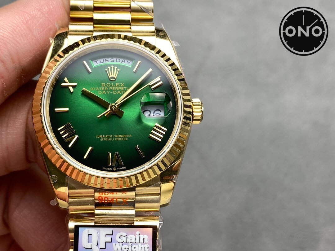 Home Rolex Day Date ONO QF Rolex Day-Date 128238 Asian 2836 36mm Gradient Green Dial 18k Yellow Gold Case Gain Weight